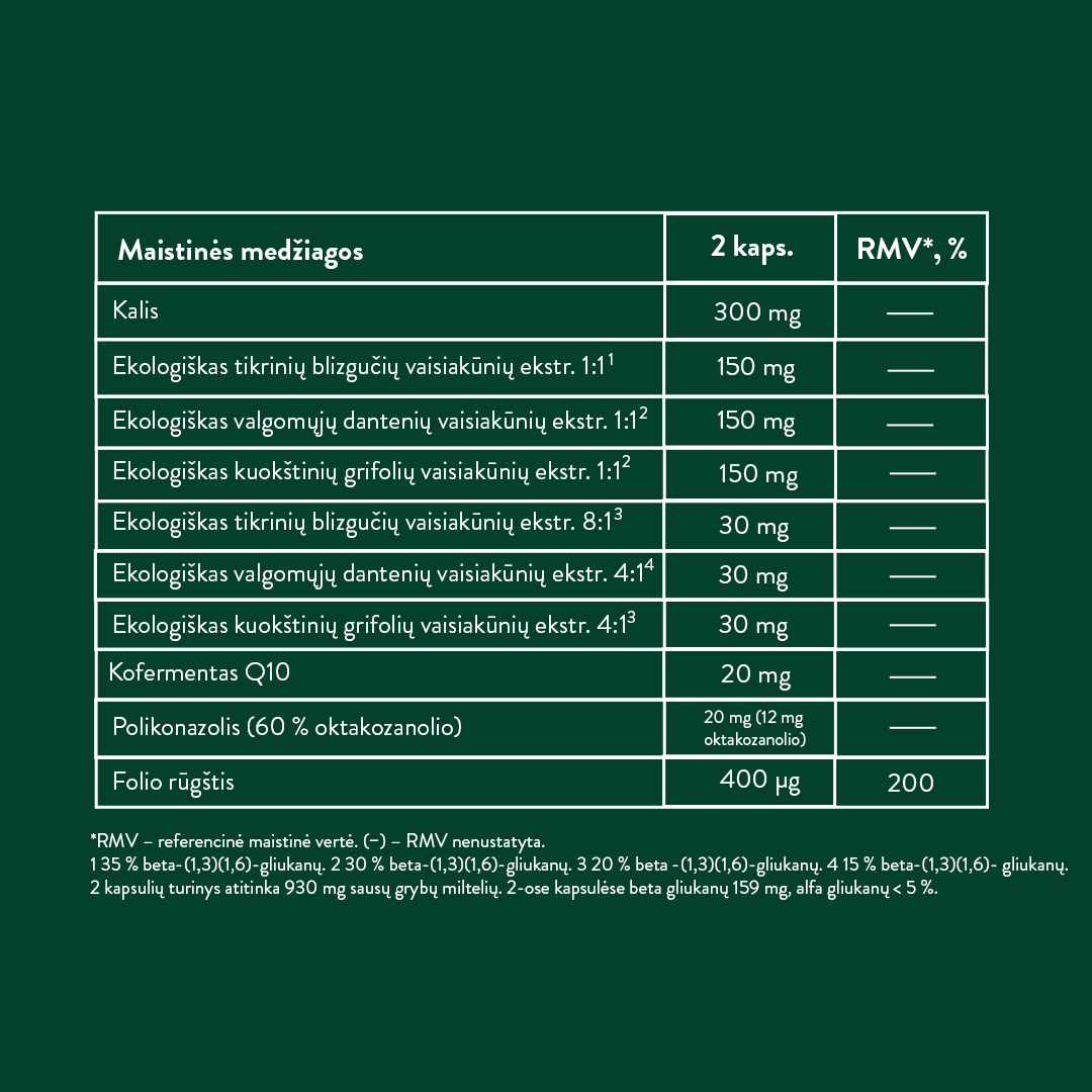 Kalio citratas, stabilizatorius hidroksipropilmetilceliuliozė (veganiškas kapsulės apvalkalas), ekologiški vaisiakūnių sausieji ekstraktai: tikrinių blizgučių (reishi; Ganoderma lucidum)* 1:1 (8,8 %), valgomųjų dantenių (shiitake; Lentinula edodes)* 1:1 (8,8 %), kuokštinių grifolių (maitake; Grifola frondosa)* 1:1 (8,8 %), tikrinių blizgučių (reishi; Ganoderma lucidum)* 8:1 (1,8 %), valgomųjų dantenių (shiitake; Lentinula edodes)* 4:1 (1,8 %), kuokštinių grifolių (maitake; Grifola frondosa)* 4:1 (1,8 %), polikonazolis, kofermentas Q10, pteroilmonoglutamo rūgštis.