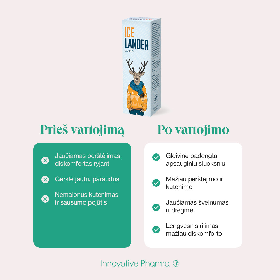 Purškalas „Icelander” – tai unikalus augalinių aliejų mišinys, skirtas skaudančiai gerklei. Specialaus purkštuko dėka išpurškiami aliejai plonu sluoksniu padengia gerklės gleivinę, taip sudarydami apsauginį barjerą nuo nepageidaujamų išorės veiksnių, sumažindami perštėjimą ir nemalonius pojūčius burnoje, tuo palengvindami rijimą.